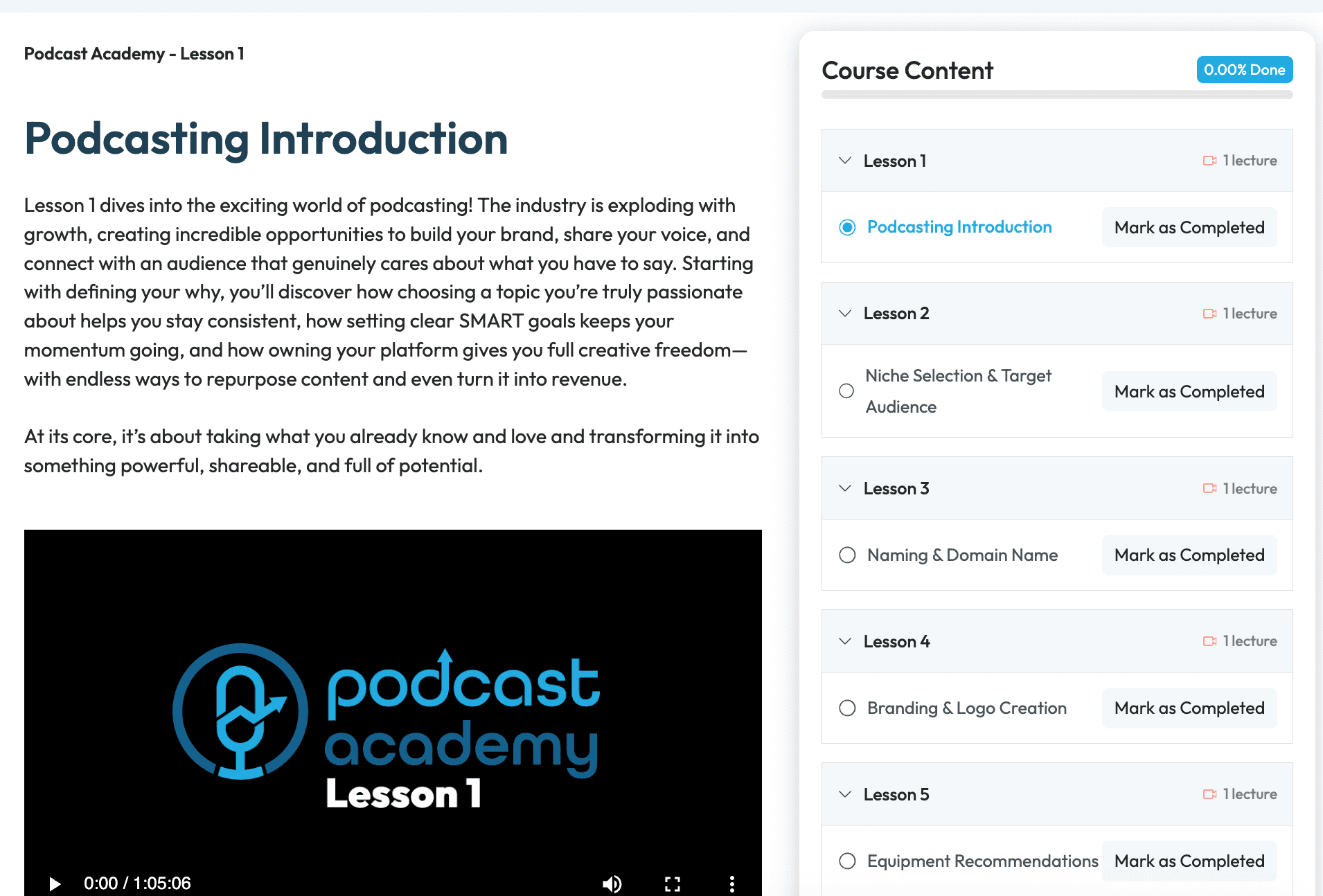 A 22-lesson launch course that walks creators through every step of starting a podcast